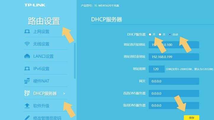 然后将其设置为开或自动,然后点击保存即可。需要注意的是,基于路由器品牌、型号的不同,内部的设置名称也有些区别,只要是标注有DHCP字样的,就是DHCP功能,开启之后再连接网络,就不会出现“以太网未启用DHCP”的情况啦。