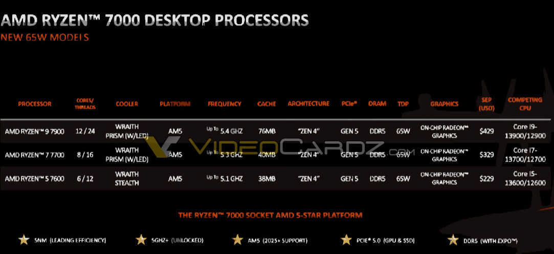 从图中可以看到,PPT 显示 AMD 锐龙 7000 系列的 R9 7900、R7 7700、R5 7600 都是 65W TDP,具体规格为: