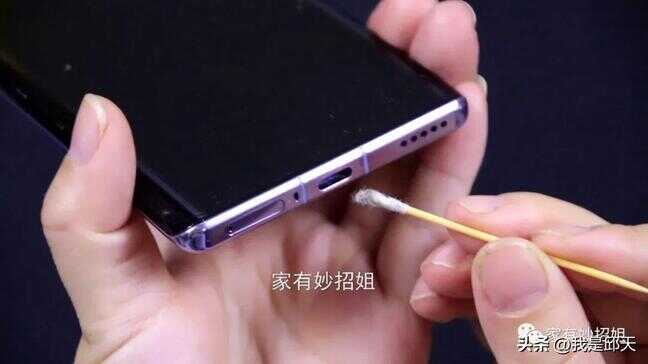 然后把它直接伸入到充电口的里面,把充电口里面都擦一擦。酒精挥发得非常快,我们也不用担心会将手机打湿。