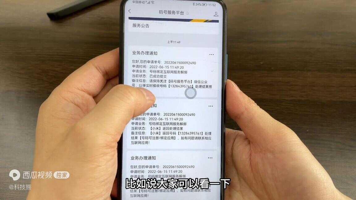 我们可以看一下接近一分钟左右就会收到一个通知,业务办理通知,比如说大家可以看一下这显示号码已经提交,然后的话比如说像这个小米账号已经完全注销掉了,我们可以重新注册重新绑定,像淘宝账户也可以直接重新注册重新绑定,这样的话基本就完成了。