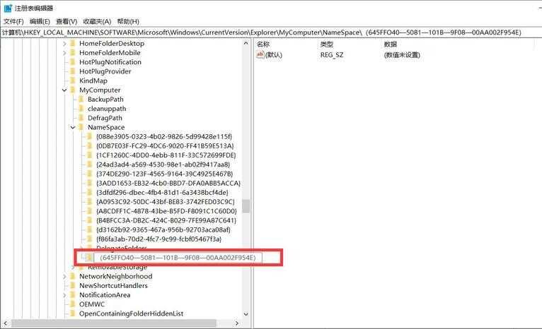 步骤3:在展开的NameSpace文件夹下找到{645FFO40——5081——101B——9F08——00AA002F954E},如果没有的话空白处鼠标右键,选择“新建”——“项”,重命名一个。