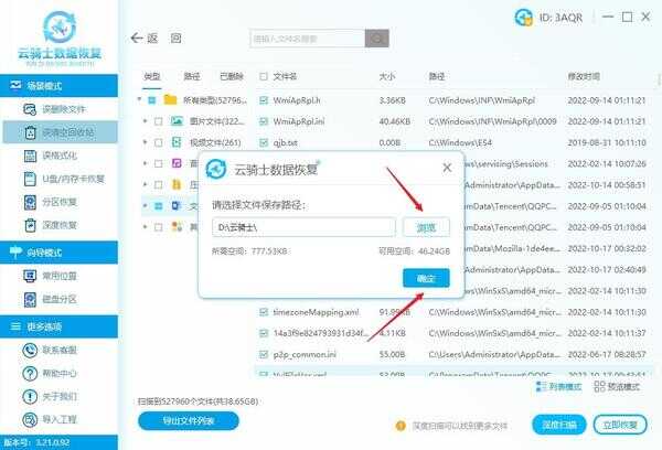 注意:设置保存路径时,不要将需要还原的文件恢复到丢失文件所在分区。