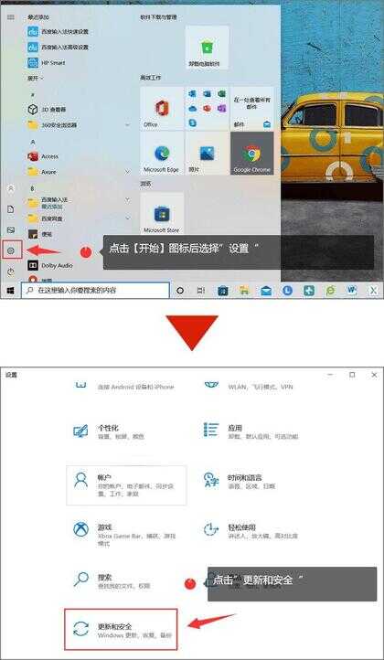 步骤1.同样点击电脑左下角【开始】图标,不过这次点击的是“设置”,然后在弹出的界面里找到并点击进入“更新和安全”;