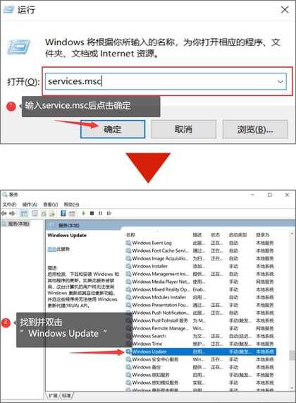 步骤2.在弹出的运行界面里的框内输入services.msc后点击确定或者抨击键盘的回车键,随后在弹出的界面我们需要找到并双击“Windows Update”;