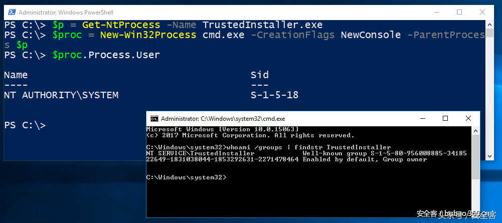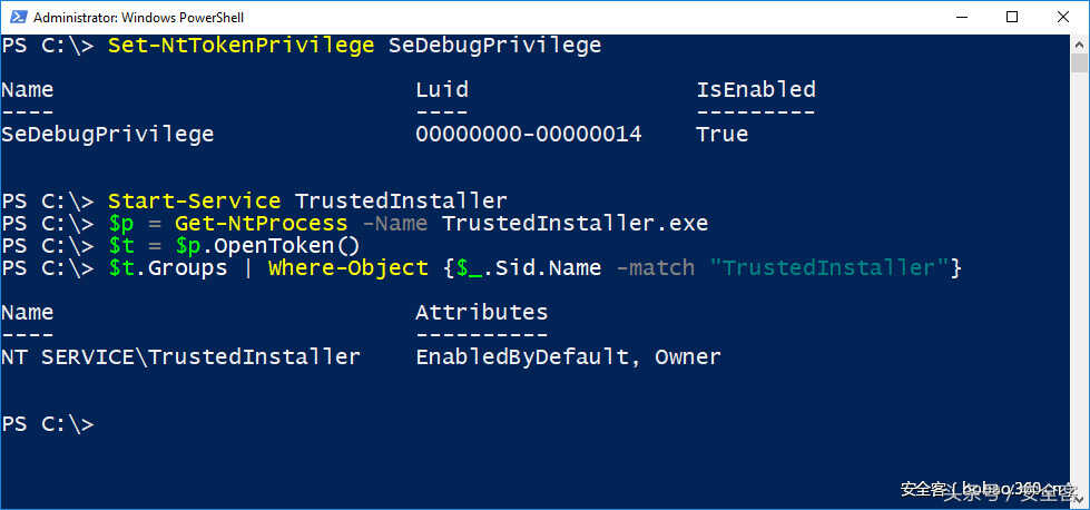 作为管理员,我们可以调用SeDebugPrivilege函数来打开TI进程和它的token。然后我们就可以做任何事情了,试一下吧: