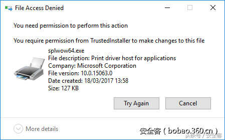 改变系统文件的权限实在不是个好主意,如果你做错了你会将操作系统暴露给EOP,尤其是对目录来说。资源管理器可以轻松地更改所有子文件和文件夹的安全属性为初始值。当然,TI会阻止你这么做的,但是总有些人出于某些目的而想要这么做。