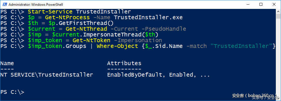 现在,只要其他线程不去设置主线程的模拟token(并且你也不要在分离出的线程上做任何事情),那么你的PowerShell控制台就是拥有TI组的状态。