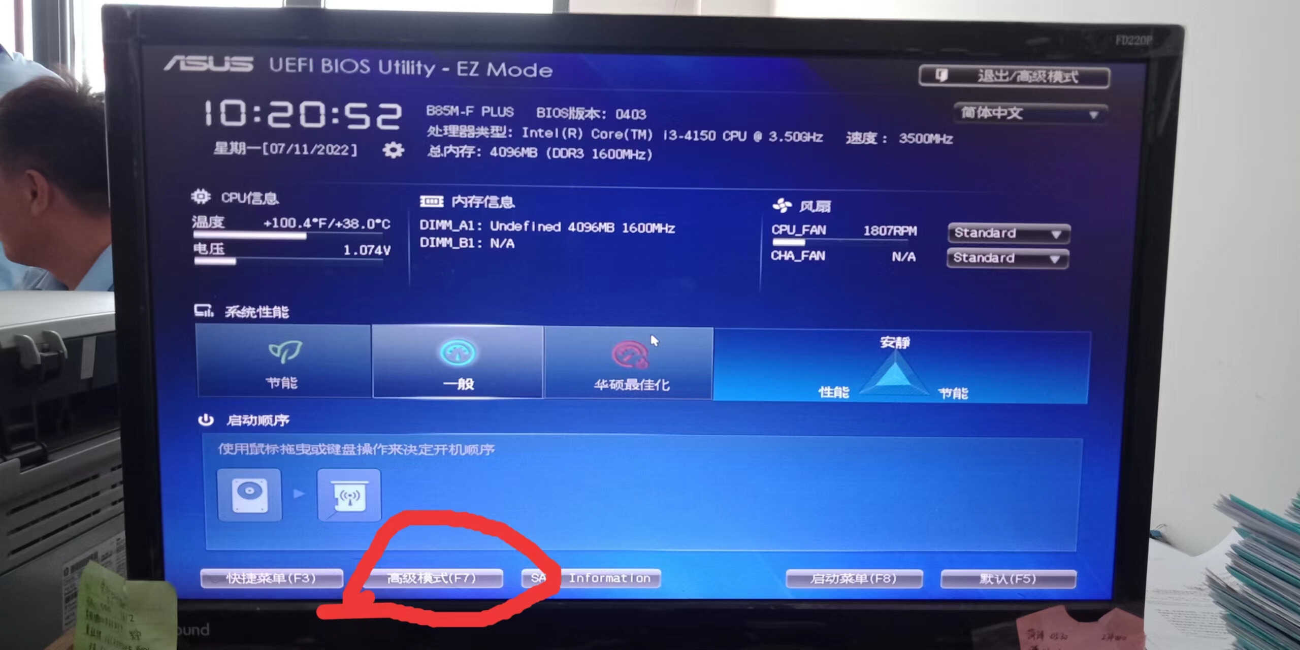 于是我就在电脑按下电源开关后,马上就按键盘上的del键,进BIOS,进BIOS后,再按F7,电脑会问,是否进入高级模式,用鼠标点确定,或者用键盘上的箭头选中确定,然后打回车,就可以看到IDE 和AHCI 的选项了,然后用鼠标或上下箭头选定AHCI后,再按F10保存,电脑就会自动重启,重启后,电脑就可以正常进系统了。