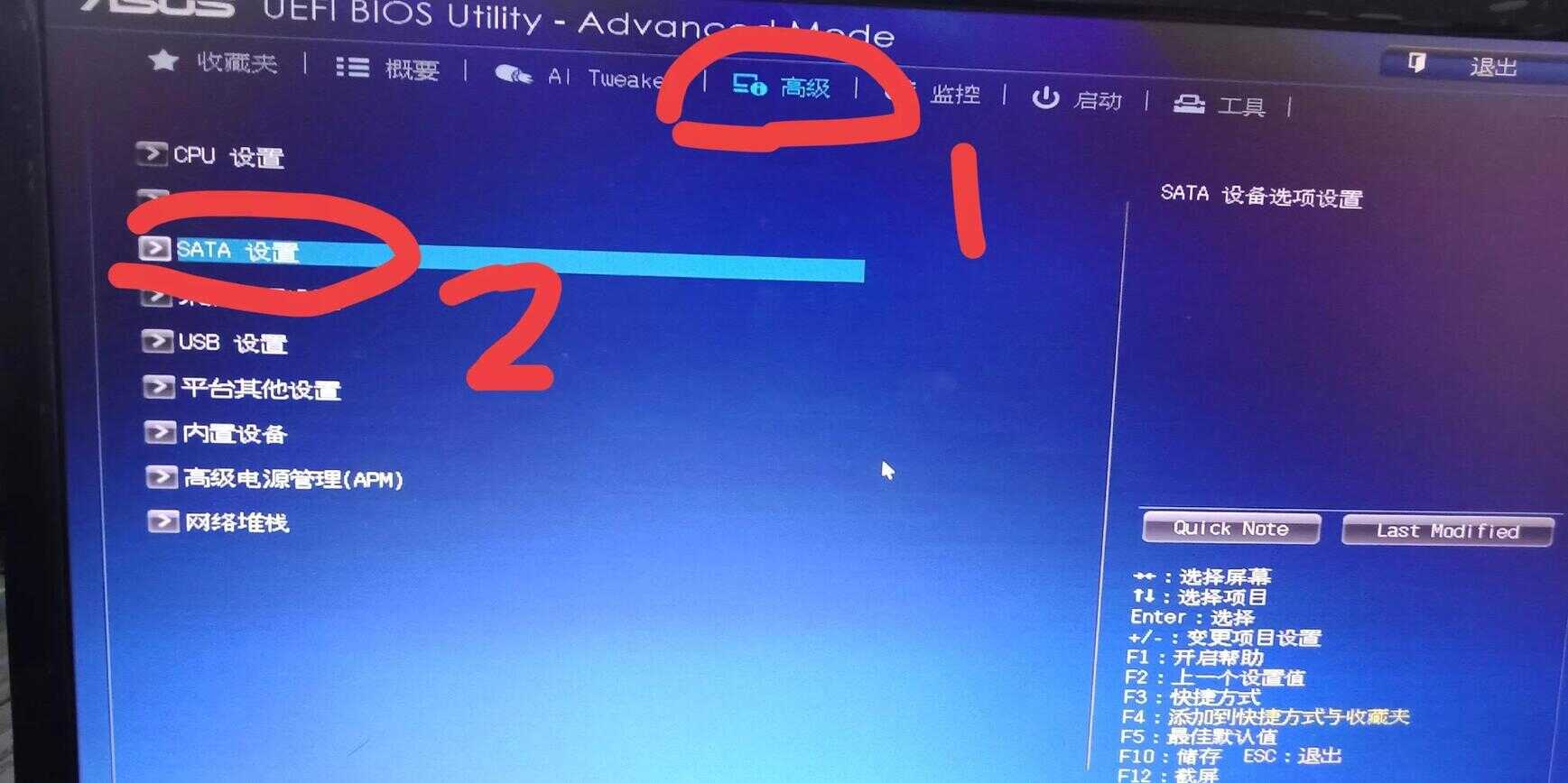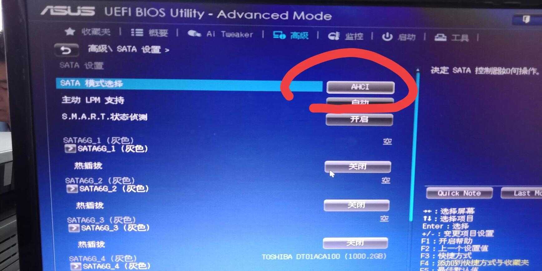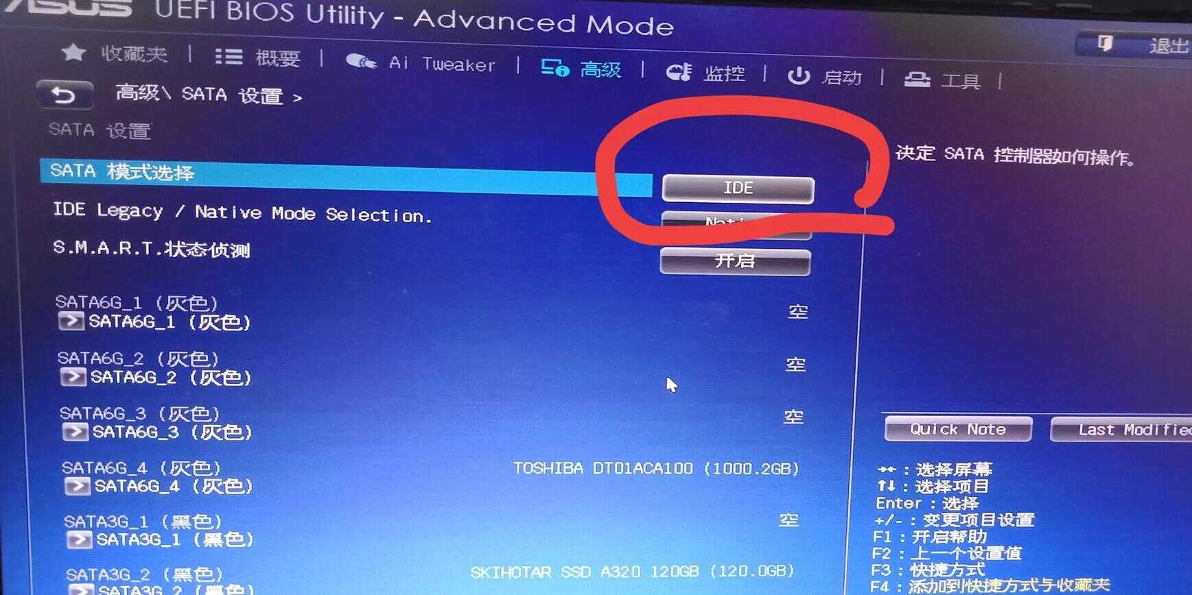 于是,我就仔细看了一下蓝屏代码是0x0000007B,我就用手机搜索如何解决电蓝屏代码为0X0000007B的解决办法,7B之前是6个0,我搜索了一下,网上说是硬盘模式的事,只要把SATA硬盘的IDE模式,改为AHCI,再按F10保存,重启后电脑就好了。