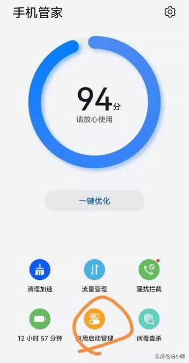 2、关闭那些不需要自启动的手机APP应用软件。关闭方法:打开手机自带的【手机管家】APP,然后找到【应用启动管理】并点击进入,关闭那些不需要自启动的手机软件。
