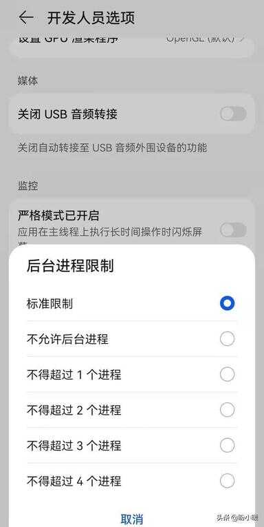 3、最后在打开的开发人员选项页面下,找到【后台进程限制】,然后根据自己的需求设置后台进程个数,一般选择【不得超过4个进程】。