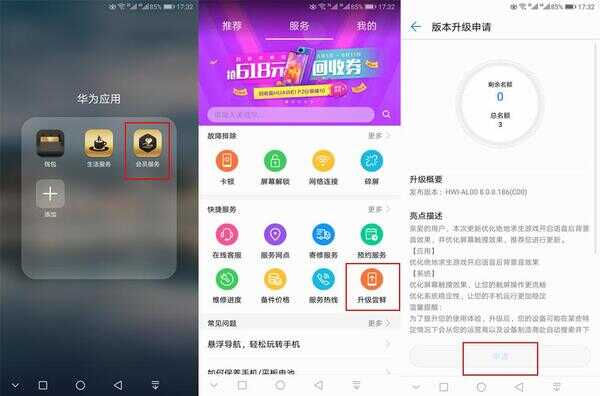 这种更新升级方式一般人很少使用,但是往往更新或升级内容属于是最新的,并且有名额限制,我们可以通过点击华为手机的【会员服务】-【快捷服务】点击【升级尝鲜】,如果发现有新版本,我们可以通过点击【申请】按键来申请新版本的更新升级服务。