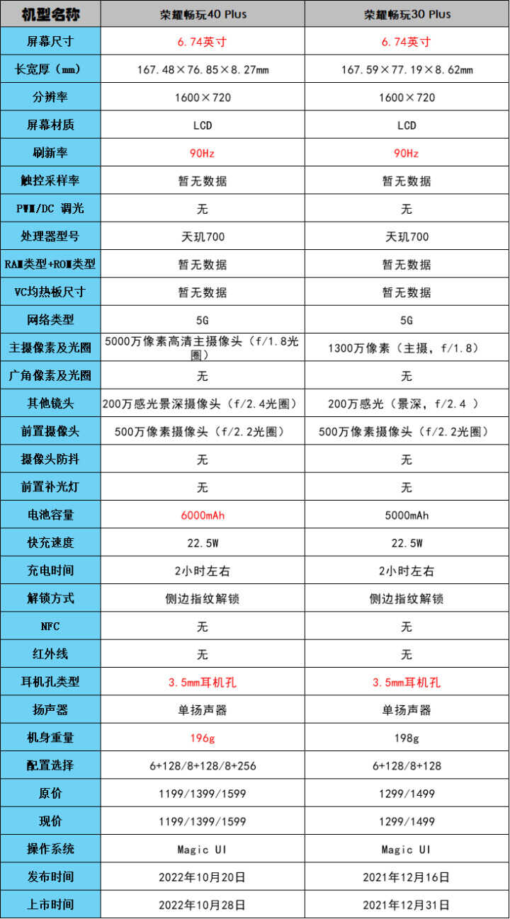 对比上一代的畅玩30Plus,这一代主要提升在于6000mAh的超大电池与主摄5000万像素镜头。机身重量上轻了2g这种小事无关痛痒。另外从价格上来说,同样配置的情况下,畅玩40 Plus比30 Plus便宜了100元。可以说性价比更上了一层。