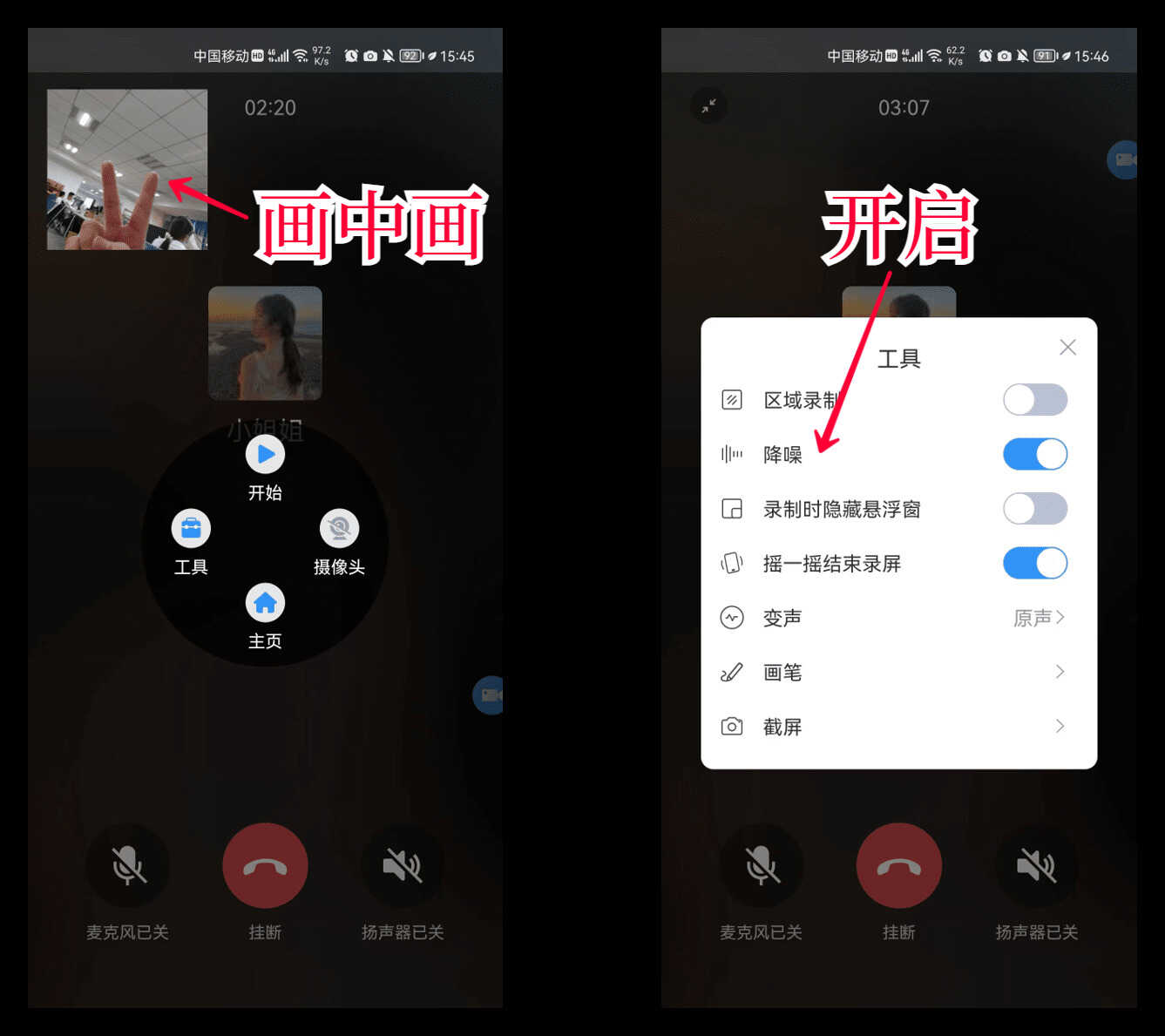 录屏的时候还能打开悬浮窗,使用摄像头录像,实现画中画的效果;在工具箱里面,开启「降噪」功能,录制出来的声音更清晰。