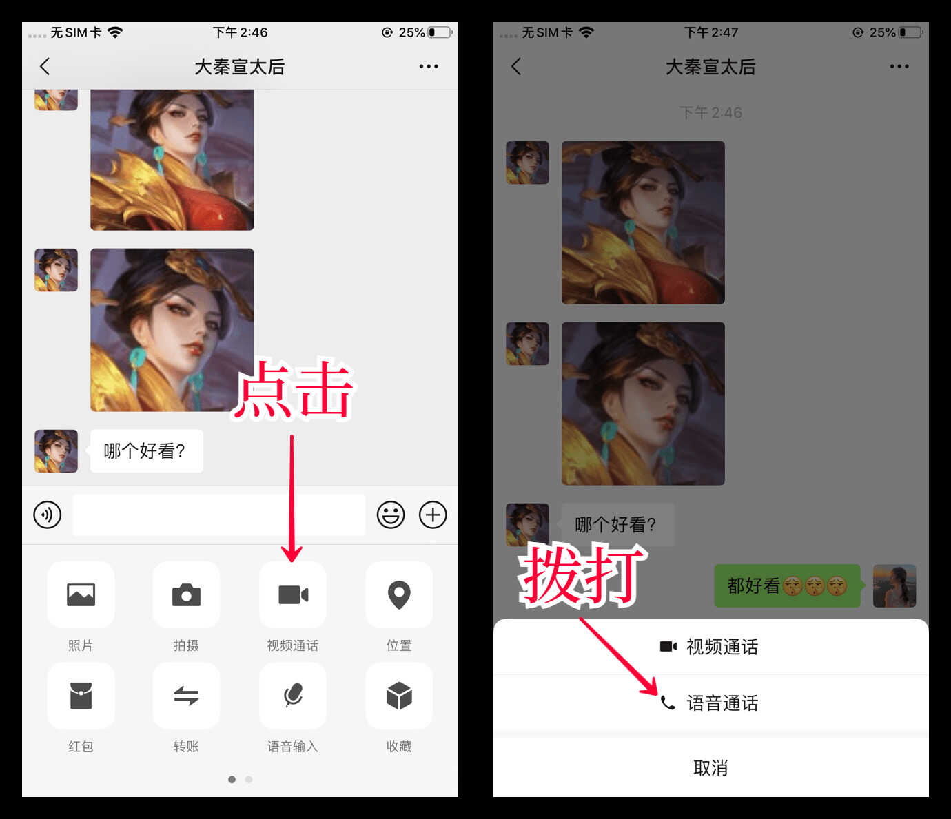 先说说iOS端,首先我们打开微信,选择任意一位好友,进入聊天窗口,点击右侧的“⨁”,选择「视频通话」-「语音通话」。