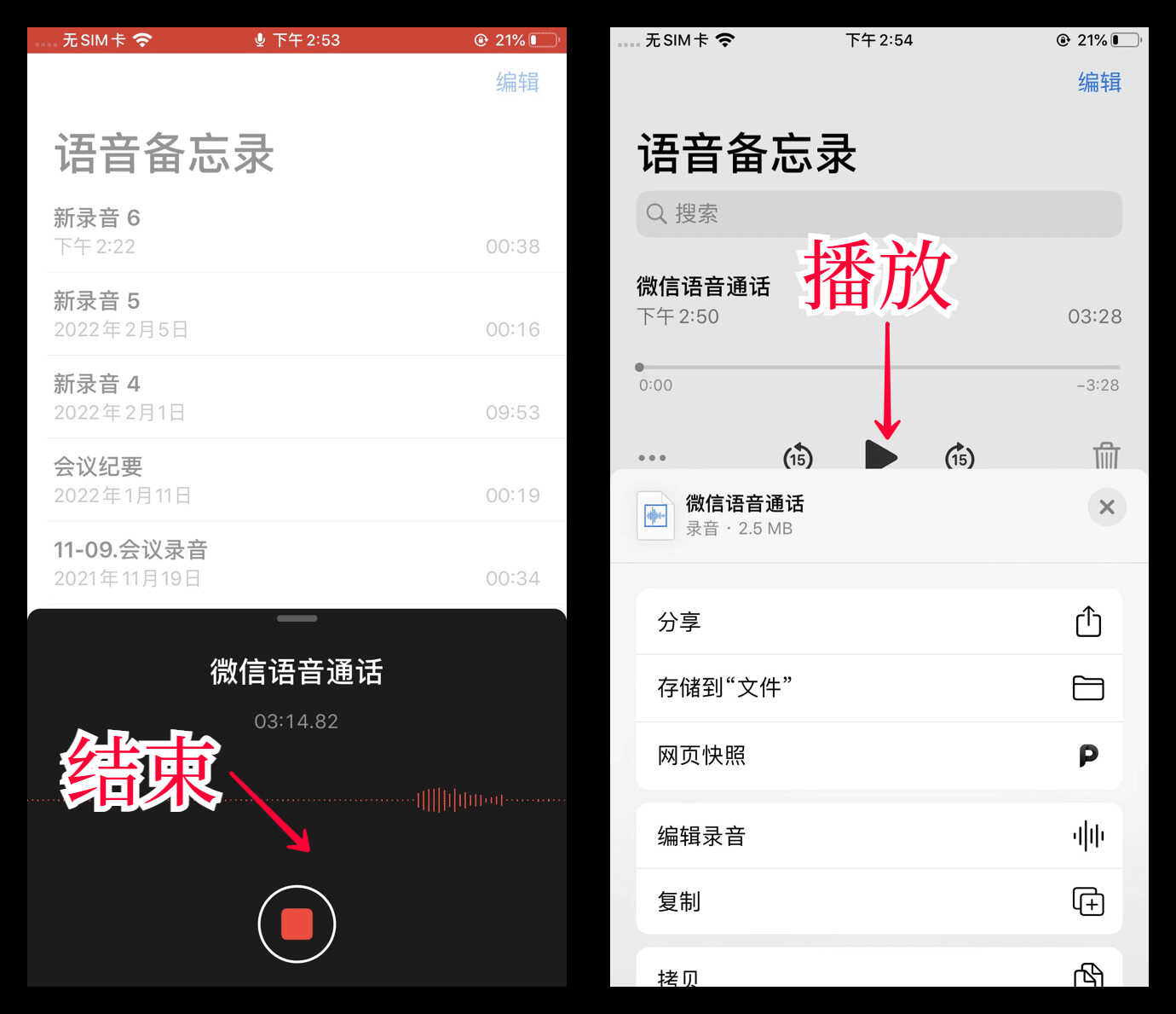 微信语音通话结束后,再次进入「语音备忘录」,点击底部的红色按钮,停止录音,双方对话就被全部录下来了,支持分享。