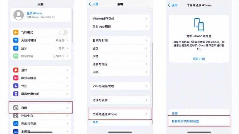 如果你的iPhone可以开机并正常使用,可以进入【设置】-【通用】-【还原】或【传输或还原iPhone】;