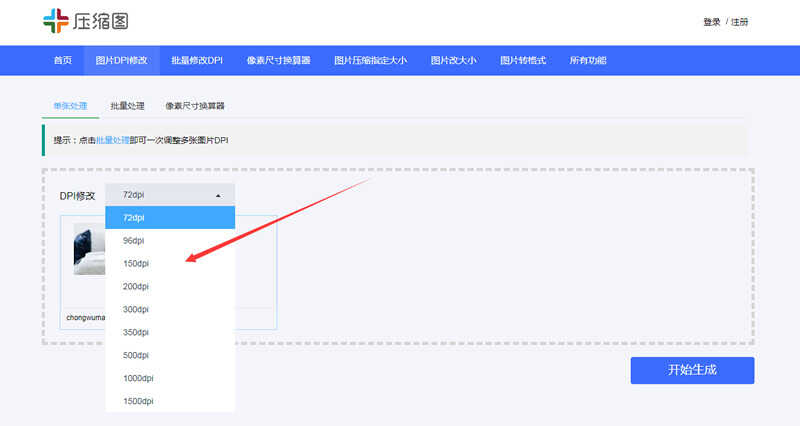 上传图片后选择dpi修改数值,支持将图片分辨率改为72、96、100、300、350dpi等,这里选择150dpi。