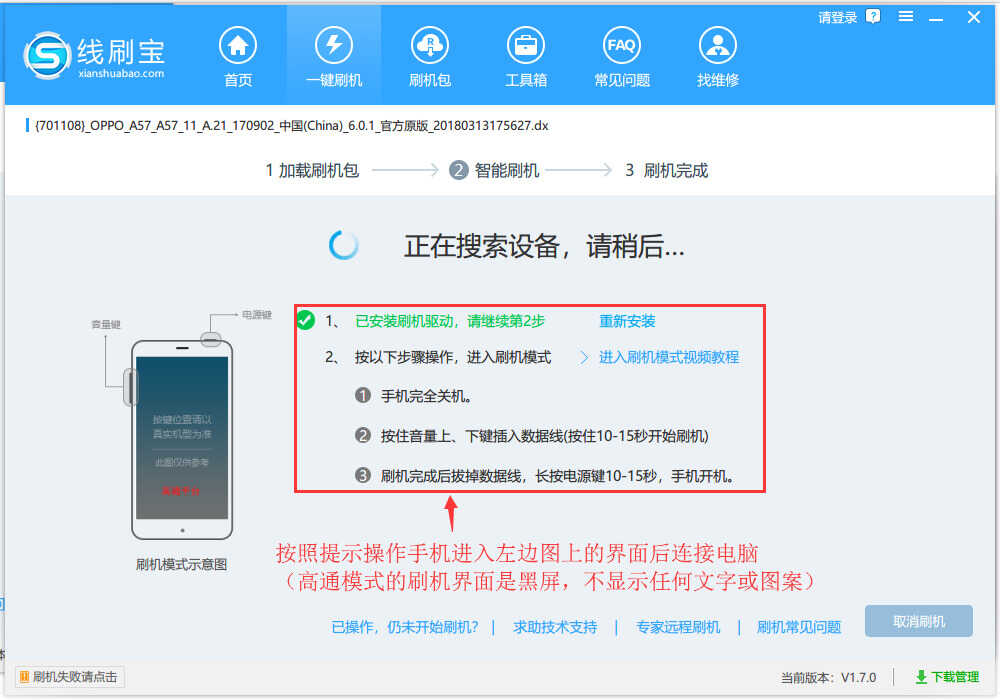 2.按照“刷机界面”提示操作手机进入刷机模式连接到电脑(台式机连接主机后面的USB口)