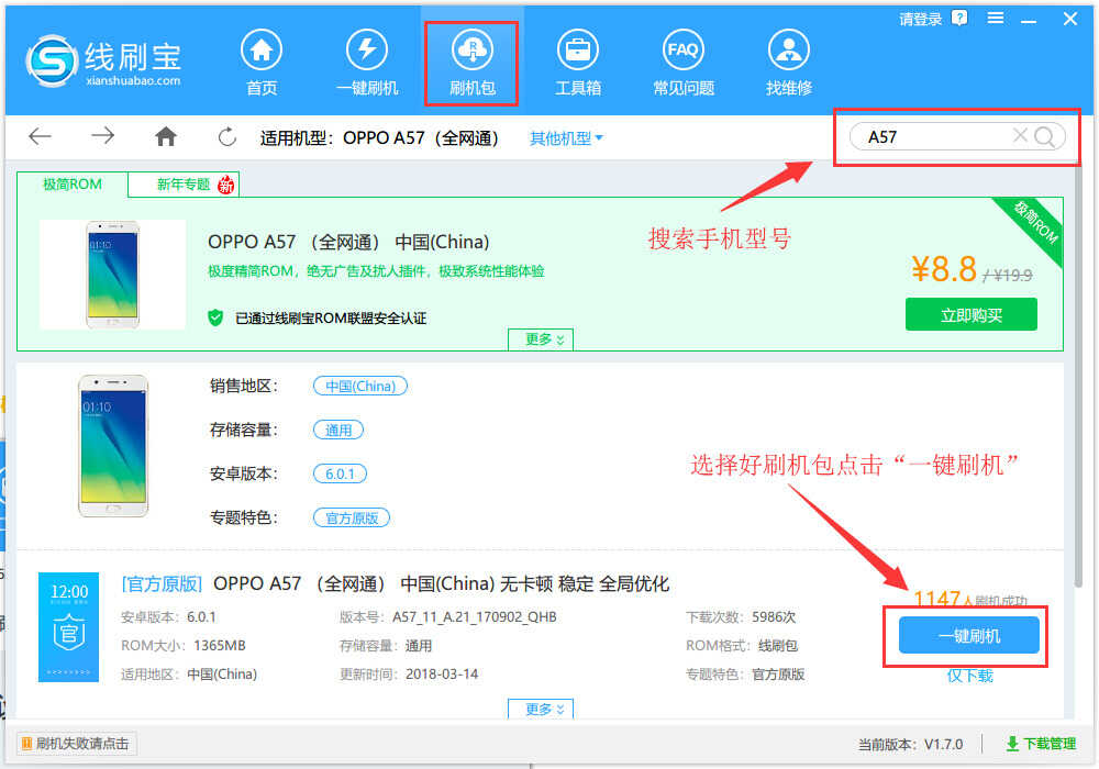 1. 打开线刷宝的“刷机包”界面,搜索刷机包后点击“一键刷机”