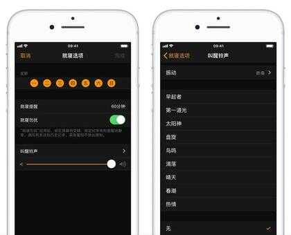 ● 或前往「时钟」-「就寝」,轻触「选项」按钮,轻触「叫醒铃声」,选择振动类型后,选择「无」即可。