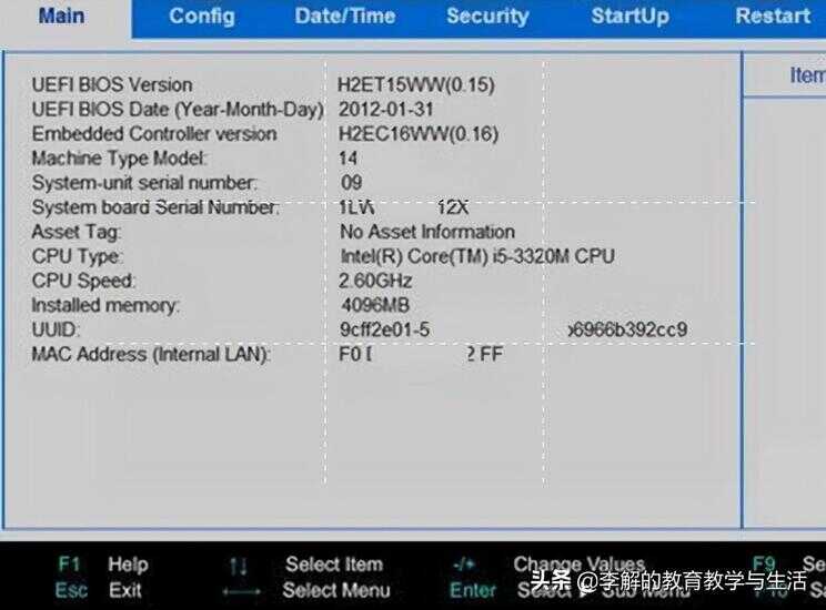 进入bios界面后,大致有main、config、Date/Time、secunity、startup、boot、Restart等选项,有时不同版本的bios会把有些选项合并整合进行简化,这些选项卡主要表示硬件信息 设置、日期时间、安全设置、启动设置的意思。