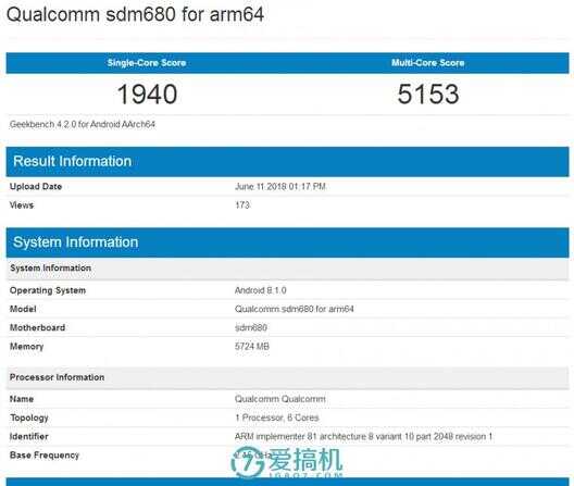 日前在跑分网站GeekBench上面出现了名为高通骁龙680的设备的跑分信息,可以看到这款设备运行内存为6GB,运行安卓8.1系统,CPU的基础频率为2.15GHz,有六个核心。
