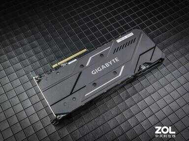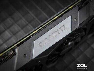 显卡背面配置了背板,PCB板被保护在下方,从灰尘、静电和重力的影响下解脱。背板颇具设计感,银色的技嘉logo安置在中心,上下均有银白色装饰条和折线型开槽。右上角的一排散热槽其实是不镂空的装饰。以这块显卡优秀的的散热能力来看,也并不需要在背板上开槽辅助散热。
