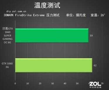 温度方面,技嘉 GTX 1660S显卡在FES压力测试中最高温度为59°C,对于已经在出厂时超过核心频率的显卡来说,温度表现相当不错。而GTX 1060 3GB则高出3°C,最高温度为62°C。