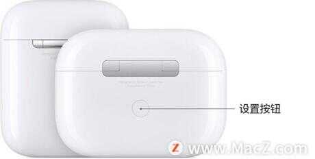 6.盖上盒盖,等待15秒钟,然后打开盒盖。按住充电盒上的设置按钮最长10秒钟。状态指示灯应该呈白色闪烁,这表明 AirPods 已做好连接准备。