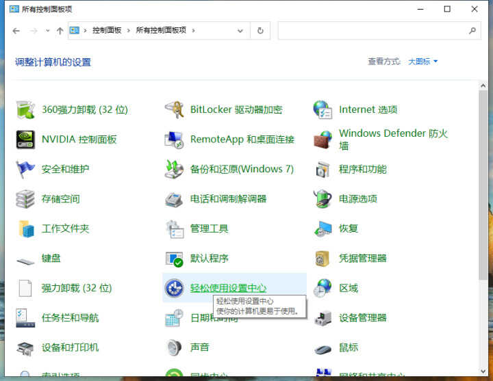 4、在选择大图标的查看方式之后我们找到轻松使用设置中心,点击进入。