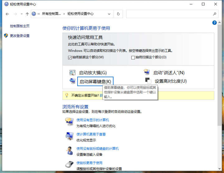 5、在轻松使用设置中心里面我们可以看到启动屏幕键盘,点击就可以打开我们的屏幕键盘了。