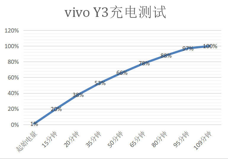 凭借5000mAh大电池和AI智能省电技术,vivo Y3提交了一份出色的续航成绩。面对5000mAh大电池,vivo Y3配备了18W双引擎闪充以保证充电效率。根据充电曲线图来看,vivo Y3从0到100%电量耗时109分钟,在充电的前半段,35分钟充进53%电量,能够在短时间内将电量提升至安心使用阶段,保证用户使用体验。