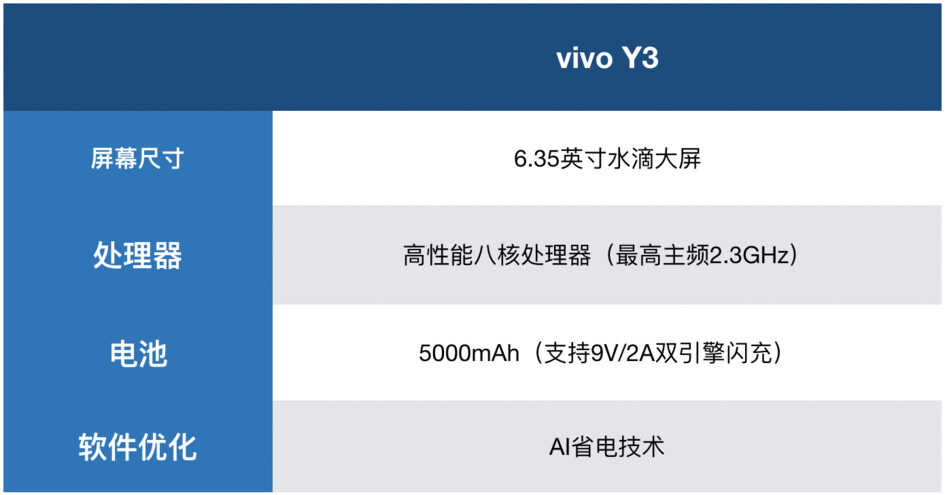 对于手机来说,屏幕尺寸、电池容量以及处理器工艺制程均会对续航结果造成影响。从参数来看,vivo Y3采用一块6.35英寸、屏占比高达89%的水滴大屏,搭载最高主频2.3GHz高性能八核心处理器,拥有出色的硬件性能。为此vivo Y3搭载了一块5000mAh大电池,并在系统中内置AI省电技术,用以提升整体的续航表现。