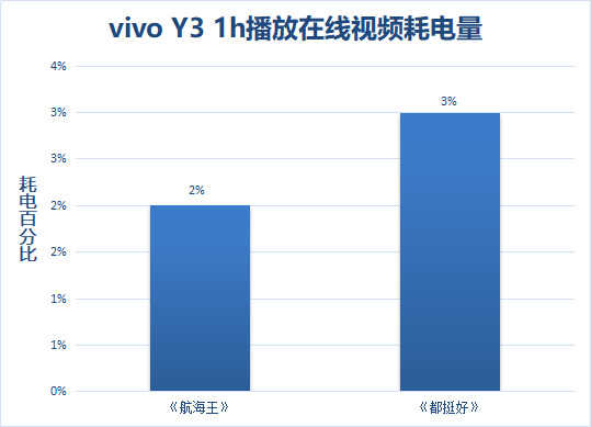 测试结果显示,vivo Y3播放《航海王》消耗2%;播放《都挺好》消耗3%,整体消耗5%。这样的成绩对于一块6.35英寸的水滴大屏来说实属难得,从侧面也可以反映出vivo Y3的5000mAh大电池与AI省电技术的作用。纵观整体中端市场,vivo Y3的视频播放表现稳居第一梯队位置。