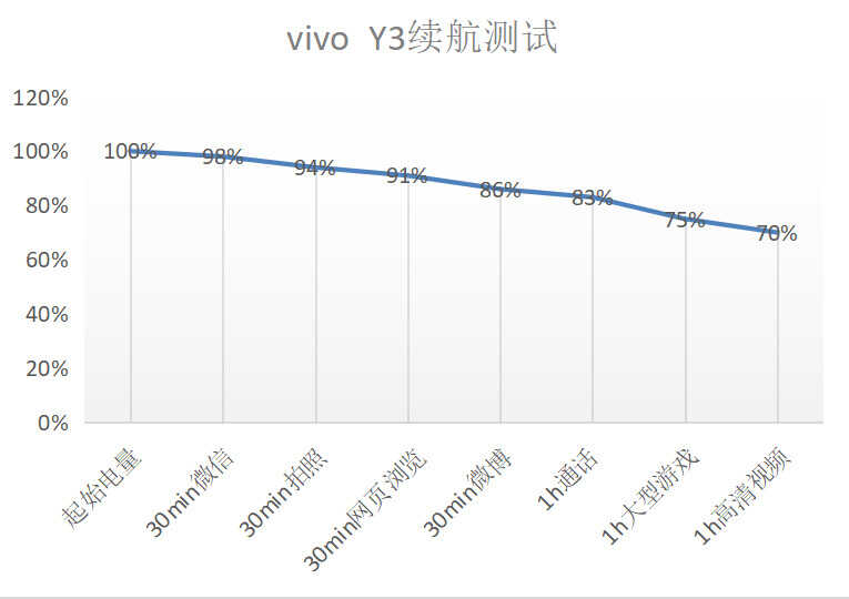 通过整体五小时标准续航结果来看,vivo Y3剩余70%电量。从续航折线图分析,整体电量消耗较为平稳,并未出现电量骤降等情况,即使是在大型游戏中,仅消耗8%电量。换算至日常使用中,vivo Y3能够满足一整天的充足续航,对于轻度用户更是能够坚持一天半甚至是两天。