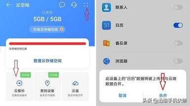 3、将需要备份的资料的开关打开,点击【合并】,手机就会自动地将资料备份到云空间。