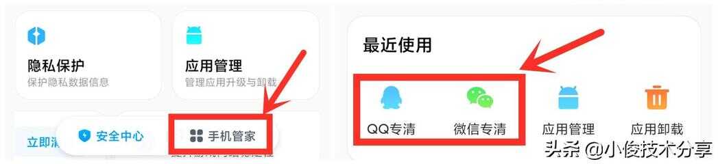 点击【手机管家】找到【QQ微信专清】