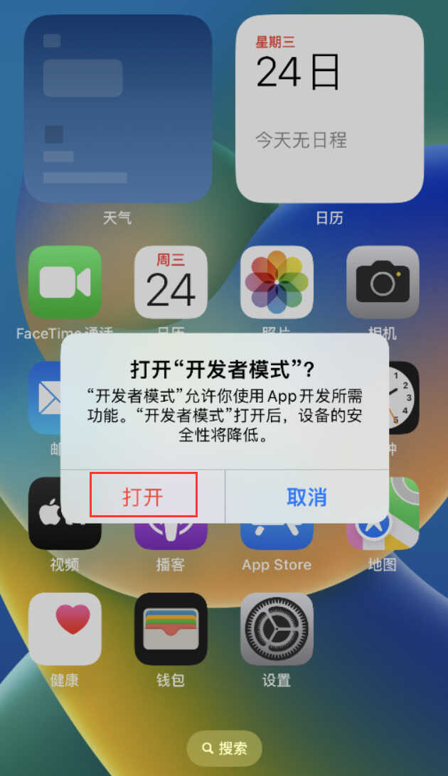 设备完成重启后,屏幕上会出现询问是否打开“开发者模式”的提示框点击“打开”,根据提示输入锁屏密码即可。