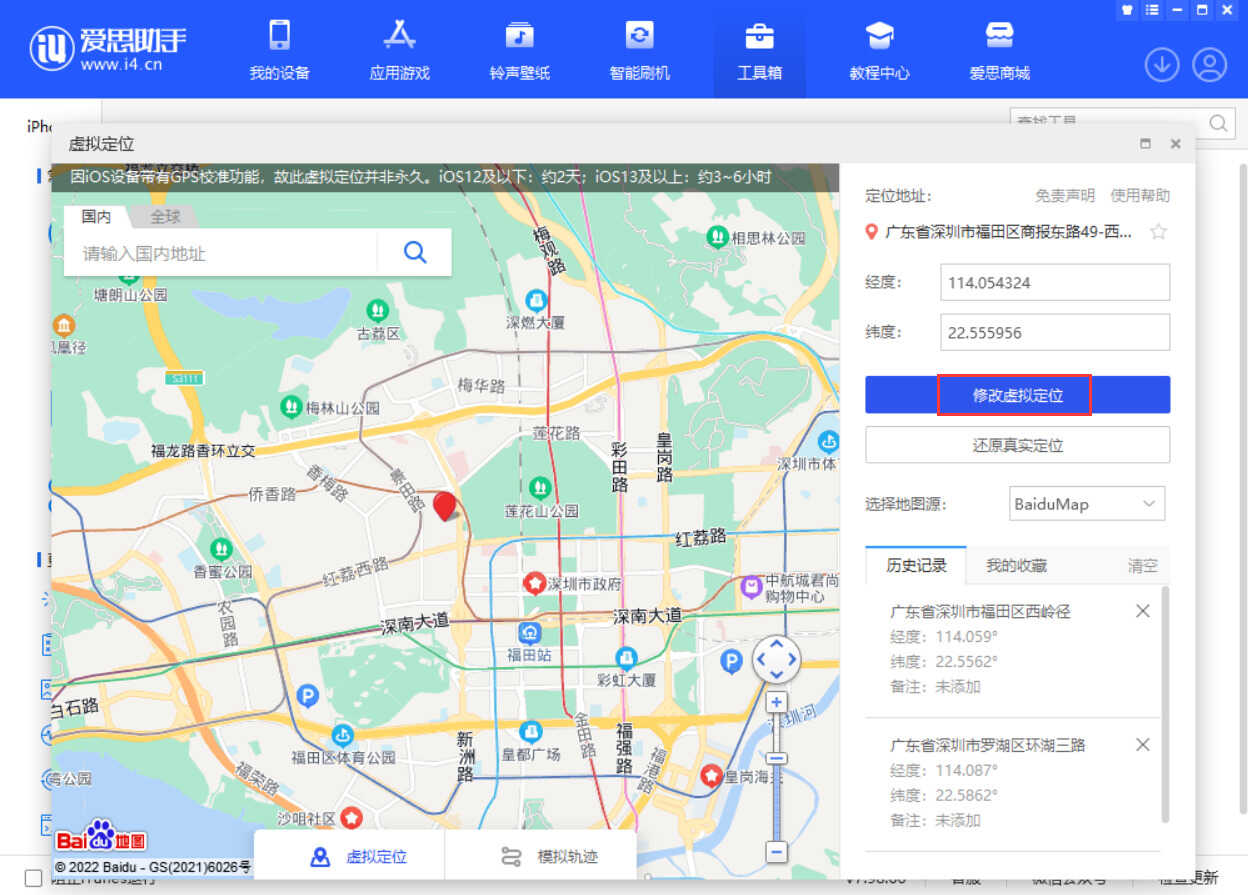 小提示:在设备上打开“开发者模式”后,可通过爱思助手虚拟定位功能修改设备位置(如要恢复正常定位,重启设备进行还原)。
