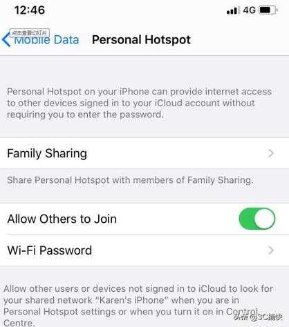 请注意,一旦打开热点,iPhone将使用3G或4G进行数据连接。这个事实很明显,但是值得一提,因为您可能会使用iPhone登录到酒店的Wi-Fi,并认为可以以这种方式共享它:您不能。