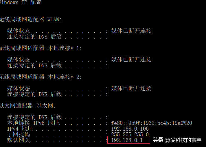 在cmd中输入ipconfig,然后我们就可以看到,在以太网下面,可以看到找到默认网关后的一串数字,我下图标注的数字,接下来,将这段数字输入浏览器中