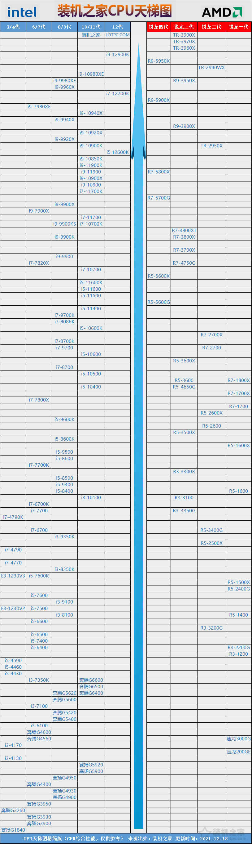 装机之家CPU天梯图精简版主要是近几代产品,intel CPU包括了四代、六代、七代、八代、九代、十代、十一代CPU以及刚推出的十二代CPU,目前装机建议的是十一代和十二代CPU,而AMD CPU主要是锐龙一代、二代、三代以及全新的四代5000系列,目前在售主要是三代和四代锐龙,现阶段装机建议首选3000系列三代与5000系列四代锐龙产品。
