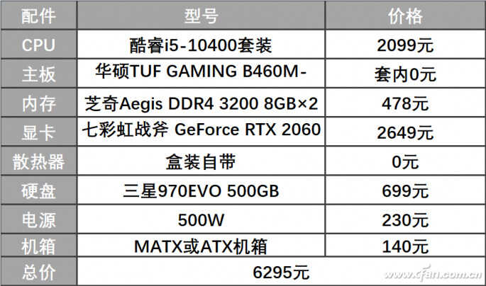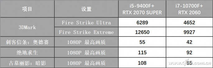 要想知道效果,我们就用两个目前常见的搭配来测试一下吧,它们分别是酷睿i5-10400F+B460+RTX 2070 Super和酷睿i7-10700F+B460+RTX 2060,其他配件完全相同,比如8GB×2内存、强力风扇、高速SSD等,显卡则基于同品牌同系列的不同芯片型号,两款显卡和两块处理器的差价接近,而两个配置的总价都在8000元出头。