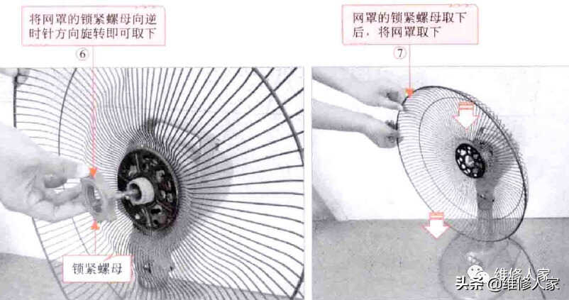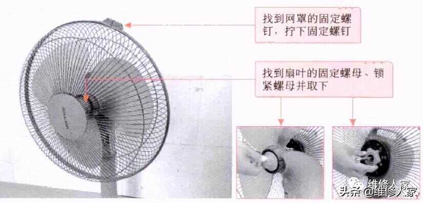 取下电风扇网罩以及扇叶,具体操作如图所示: