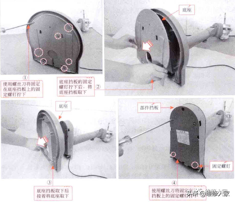 电风扇的底座以及挡板多用来固定电风扇的整机,以达到稳固电风扇的目的。对底座及挡板进行拆卸时,应先观察电风扇底座以及挡板固定方式,然后使用合适规格的螺丝刀进行拆卸即可,如下图所示: