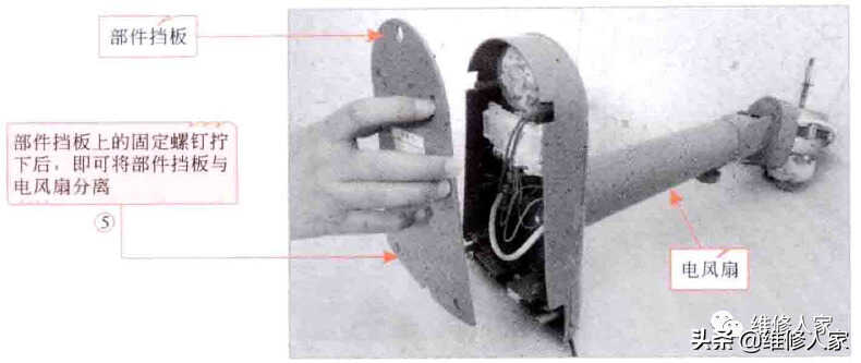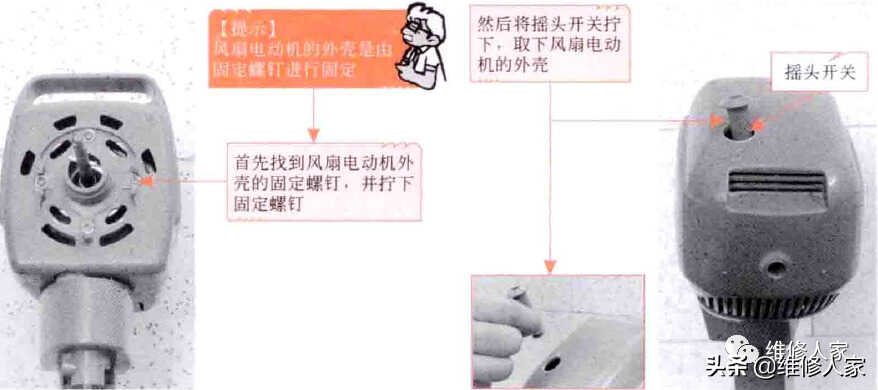 电风扇的电动机由固定螺钉固定在电风扇的外壳中,怀疑是电风扇中电动机出现故障时,应先将电动机的外壳进行拆卸,拆卸电动机的外壳时,应先观察电风扇外壳的固定方式,然后将固定螺钉拧下,即可找到需要检修的电动机,如下图所示: