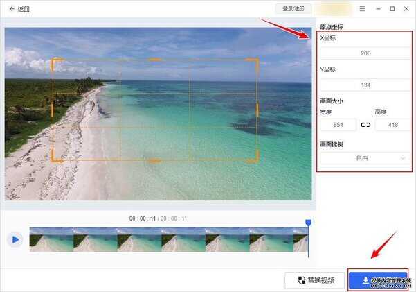 步骤三:导入视频后,我们可以在右侧进行更具体的裁剪操作,我们可以在右侧的原点坐标输入X和Y的启示数值,这里不仅能自由拖动方框进行大小裁剪,系统还自带多个平台画面比例选项,我们可以随意设置或者根据需要上传的平台进行相对于的调整。设置好参数后,我们点击【立即裁剪】,我们即可得到裁剪好的视频。并且该软件的存储位置默认是桌面,我们查找使用都非常方便。