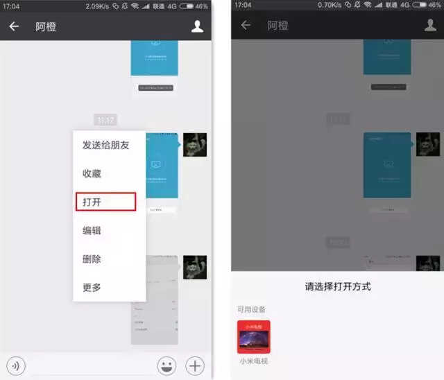 长按微信聊天窗口中的文件(图片、音乐或文档),点击打开,分享到已经绑定的小米电视,就可以看到电视上呈现出您刚刚选中的文件啦。要打开PPT、Word、Excel或PDF文档,需要先在电视端下载安装WPS office软件。