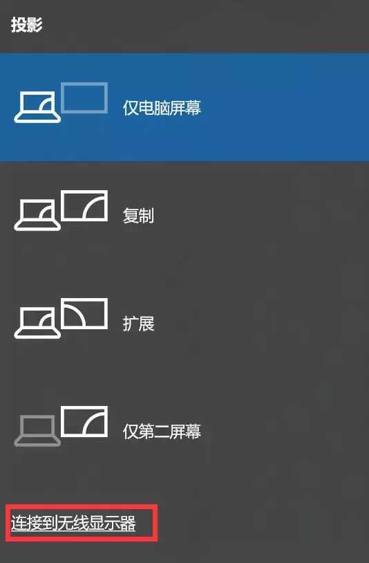 第二步,在小米笔记本上按F6键,电脑显示屏右侧显示如下界面,选择“连接到无线显示器”。